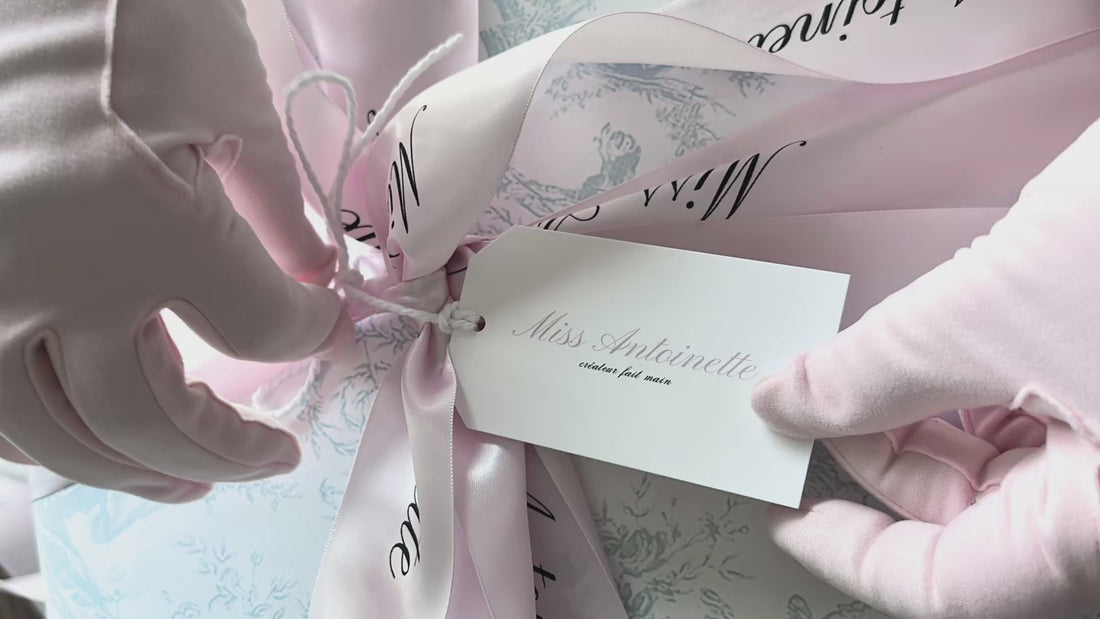 Each of our exquisite items will be elegantly wrapped with a vintage French floral paper, adorned with our signature pink Miss Antoinette ribbon, and accompanied by a heartfelt thank you card.